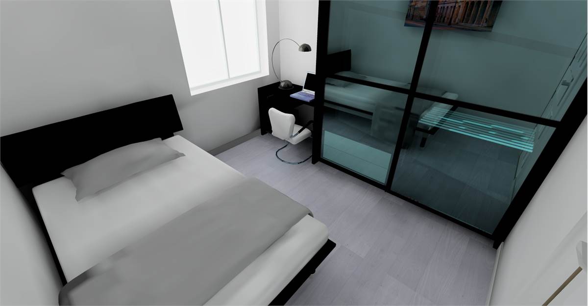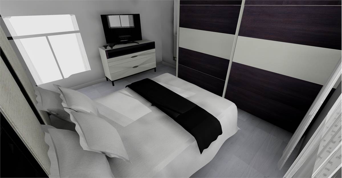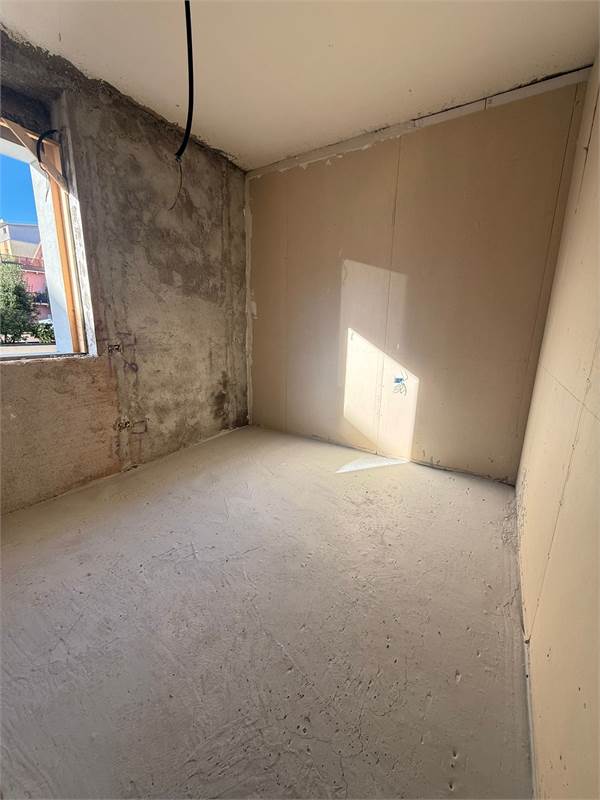 L’ingresso apre su una zona living accogliente con cucina a vista, predisposta per l’aria condizionata. La zona notte comprende una camera matrimoniale, una cameretta e un bagno finestrato con raffinata doccia in ardesia 80×100. Un balcone completa l’abitazione.